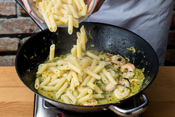 „Penne“ ist der Plural des italienischen Wortes „penna“, was im Lateinischen „Feder“ bedeutet. Wer sich die Form der beliebten Nudeln ansieht, erkennt, warum man ihr diesen Namen verliehen hat. Die Pastasorte eignet sich hervorragend, um die leicht buttrige Zucchini-Zitronen-Sauce mit Knoblauch aufzunehmen. Die Garnelen werde nur kurz mitgebraten und bleiben so schön saftig. Guten Appetit!