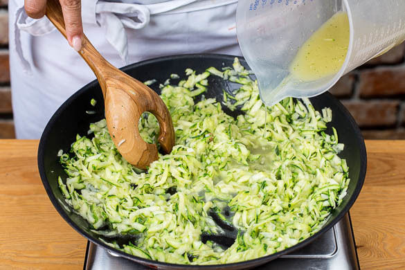 In einer großen Pfanne 2EL Butter oder Pflanzenöl auf mittlerer Stufe erwärmen. Die Zucchiniraspel mit 1 Prise Salz in die Pfanne geben und 3–5Min. anbraten. Den Knoblauch dazugeben und 1–2Min. mitbraten, dann die 1/2 der Gewürzmischung oder mehr nach Geschmack unterrühren.