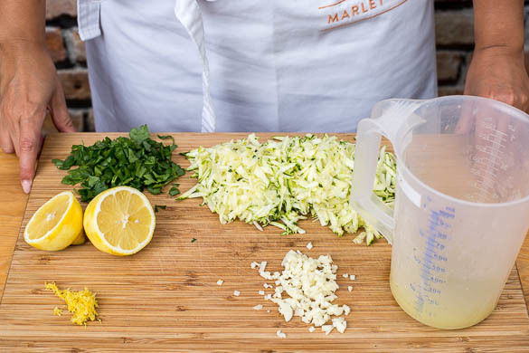 In einem mittelgroßen Topf ausreichend gesalzenes Wasser für die Pasta zum Kochen bringen. Die Zucchini mit einer Küchenreibe grob raspeln. Die Zitronenschale abreiben und halbieren, eine Hälfte auspressen, die andere Hälfte in Spalten schneiden. Den Knoblauch schälen und fein würfeln. Die Petersilie samt Stängeln grob hacken.