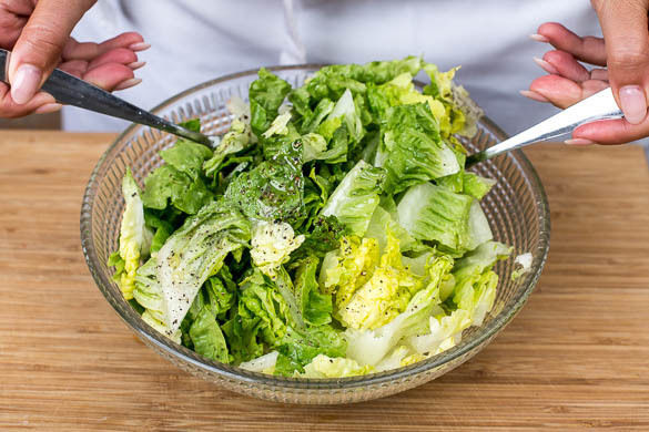 Den Romanasalat in mundgerechte Stücke schneiden. Aus 1–2EL Olivenöl, 2EL Essig und je 1 Prise Salz, Pfeffer und Zucker ein Dressing anrühren und mit dem Salat mischen. Die Garnelen-Pasta auf Teller verteilen, mit der Petersilie und den Zitronenspalten garnieren und mit dem Salat servieren.