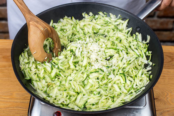 In einer großen Pfanne 2–3EL Butter oder Pflanzenöl auf mittlerer Stufe erwärmen. Die Zucchiniraspel mit 1 Prise Salz in die Pfanne geben und 3–5Min. anbraten. Den Knoblauch dazugeben und 1–2Min. mitbraten, dann ca. 2/3 der Gewürzmischung oder mehr nach Geschmack unterrühren.