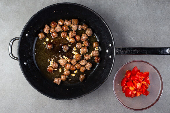 Die Würste in 1–2cm große Stücke schneiden. Den Knoblauch schälen und grob würfeln. Die Würste und den Knoblauch in einer großen Pfanne mit 1TL Olivenöl bei mittlerer Hitze ca. 3Min. anbraten. Währenddessen die Tomate in ca. 2cm große Stücke schneiden.