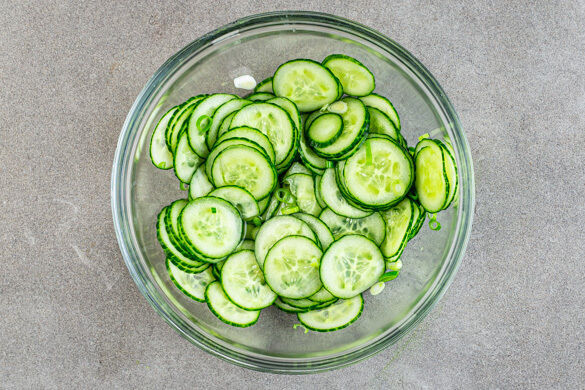 500ml Wasser in einem Wasserkocher aufkochen. Inzwischen 2TL Zucker und 1TL Salz in 4EL hellem Essig und 2EL Wasser auflösen. Die Gurke in dünne Scheiben schneiden, die Lauchzwiebeln in feine Ringe schneiden. Beides mit dem Einlegesud vermengen und bis zum Servieren beiseitestellen.