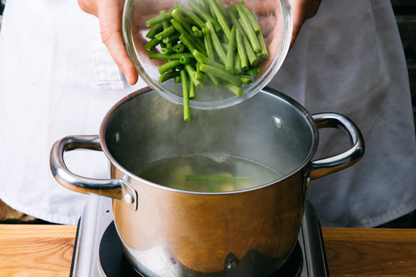 Die Enden der Bohnen abschneiden und die Bohnen quer halbieren. Die Bohnen in den letzten 4–5Min. zu den Kartoffeln geben und bissfest kochen. Beides in ein Sieb abgießen und kalt abschrecken.