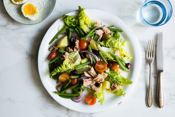 Dieser Klassiker stammt aus der französischen Mittelmeerstadt Nizza, die dem Gericht auch ihren Namen leiht. Ein tolles Geschmackserlebnis dank knackigem Romanasalat, feinem Thunfisch, fruchtigen Tomaten und besten Oliven, komplettiert durch grüne Bohnen und Kartoffeln. Bon appétit!