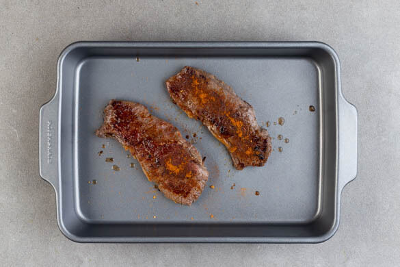 Das Fleisch in eine kleine Auflaufform geben, mit dem Bratensaft beträufeln und mit der Gewürzmischung bestreuen. Im unteren Teil des Ofens 5–10Min. weitergaren, je nachdem, ob es medium oder durch sein soll. Den Knoblauch vom Backblech nehmen. Das Gemüse 5–7Min. weiterbacken, bis es appetitlich gebräunt ist, davor ggf. die Position der Bleche tauschen.