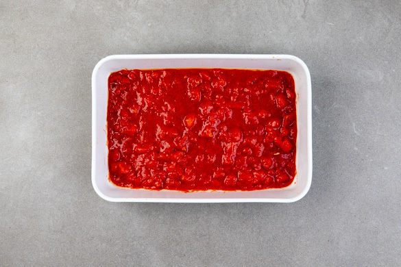 Die gehackten Tomaten in eine Auflaufform geben und mit 1–2TL Essig, 1 Prise Zucker sowie Salz und Pfeffer würzen.