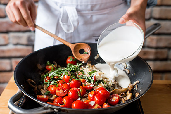 Sojasahne ist eine vegane – und somit laktosefreie –, kalorienarme Alternative zu Sahne aus Kuhmilch und dabei mindestens genauso cremig! Mit ihrem nussigen Aroma ist sie der perfekte Partner für dieses schnelle Pastagericht mit frischen Champignons, fruchtigen Kirschtomaten, aromatischem Basilikum und gerösteten Mandelblättchen.