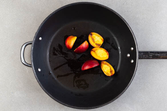 Die Nektarine halbieren und entsteinen, das Fruchtfleisch in 6 Spalten schneiden. Die Nektarinenspalten in einer mittelgroßen Pfanne mit 1TL Butter bei mittlerer Hitze auf jeder Seite 1–2Min. braten, bis sie leicht gebräunt sind, dann aus der Pfanne nehmen und beiseitestellen. Tipp: Wenn die Nektarinenspalten noch sehr fest sind, vor dem Braten 1 Prise Zucker darüberstreuen.
