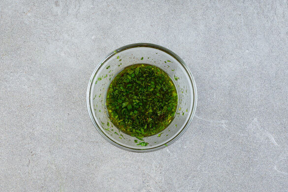 Die ½ der Petersilienblätter oder mehr abzupfen und fein hacken. Den Schnittlauch in kleine Röllchen schneiden. Das Aprikosenchutney mit den Kräutern, 1EL hellem Essig und ½TL Salz verrühren, bis sich das Salz aufgelöst hat. Anschließend 2EL Olivenöl, 1EL Wasser und 1 Prise Pfeffer unterrühren.