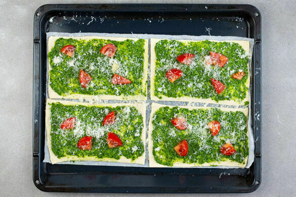 Die Teige mit dem Papier nach unten auf zwei Backblechen ausrollen und vierteln. Tipp: Wer mag, kann die Ecken jeweils nach unten umklappen, um einen runden Rand zu formen. Die Teige mit der ½ des Pestos bestreichen und die Tomaten und den Käse darüberstreuen. Die Pizzabrote 10–12Min. im Ofen backen, bis der Teig außen knusprig und in der Mitte durchgebacken ist.