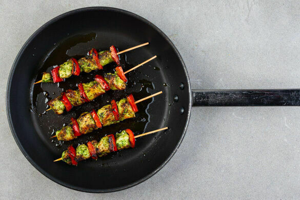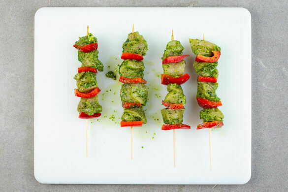 Heute wird’s spießig! Und damit meinen wir nicht die geblümte Wohnzimmertapete und wir wollen dir auch nicht vorschlagen, dein Auto mit dem Brillenputztuch zu wienern. Nein, heute ziehst du zartes Hähnchenbrustfilet und knackige Paprika auf Schaschlikspieße und brätst alles scharf an. Dazu reichst du knuspriges Pizzabrot mit würzigem Pesto, fruchtigen Tomaten, pikantem Käse und nussigem Rucola. So geht Spießbürger!