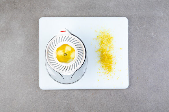 Die Zitronenschale abreiben, dann die Zitrone halbieren und auspressen.