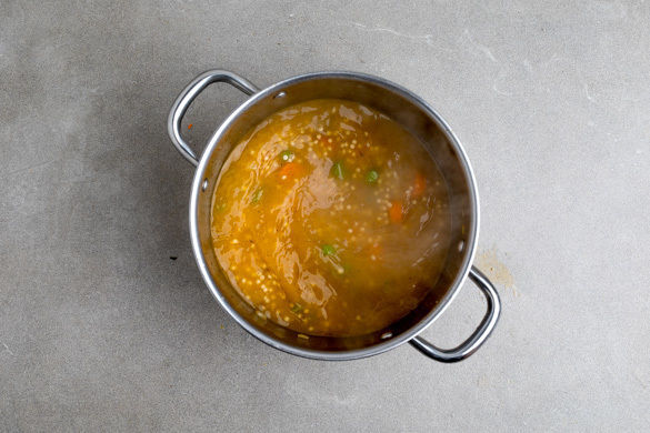 Das Gemüse und den Perlencouscous mit 1,7L Wasser ablöschen, das Brühgewürz hinzugeben und alles zum Kochen bringen. Bei mittlerer Hitze 5–6Min. köcheln lassen.