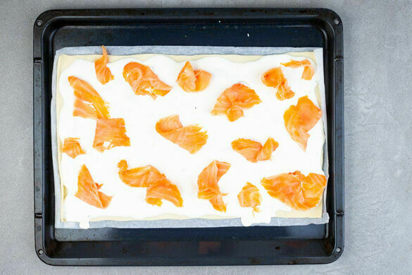 Die Teige mit dem Papier nach unten auf zwei Backblechen ausrollen und gleichmäßig mit der Crème fraîche bestreichen.
