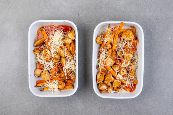 Den Ofen nach Möglichkeit auf 240°C Grillfunktion umstellen. Die Gemüsestifte in eine Auflaufform geben, das Fleisch darauf verteilen und mit der ½ der Sweet-Chili-Sauce beträufeln. Mit der ½ des Käses bestreuen und im Ofen ca. 5Min. grillen bzw. überbacken, bis der Käse goldbraun zerlaufen ist. Tipp: Wer mag, kann für jede Portion eine kleine Auflaufform verwenden.