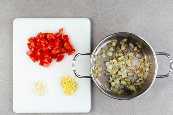 Die Zwiebeln schälen, halbieren, grob würfeln und in einem zweiten mittelgroßen Topf mit 1EL Pflanzenöl bei mittlerer Hitze ca. 5Min. glasig anschwitzen. Inzwischen den Knoblauch und den Ingwer schälen und grob würfeln, die Tomaten vierteln und in grobe Stücke schneiden.