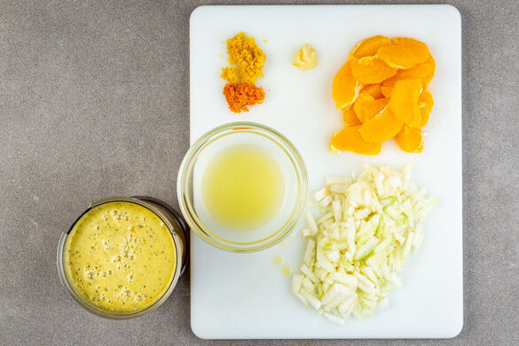 Die Zwiebeln und den Knoblauch schälen und fein würfeln. Jeweils 2TL Orangen- und Zitronenschale abreiben. Die Orangen dann bis zum Fruchtfleisch schälen und das Fruchtfleisch in ca. 1cm dicke Spalten schneiden. Die Zitrone halbieren und auspressen. Das Brühgewürz in 1,5L heißem Wasser auflösen.