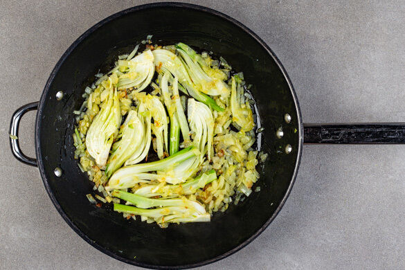 Den Fenchel halbieren und in ca. 0,5cm dünne Spalten schneiden, evtl. nochmals halbieren. 6–8 Spalten für später beiseitelegen. Das Fenchelgrün für die Garnitur beiseitelegen. Die Zwiebeln in einer großen Pfanne mit 1EL Olivenöl bei mittlerer Hitze 1–2Min. glasig anschwitzen. Den Fenchel und den Knoblauch zugeben und ca. 2Min. mitbraten.
