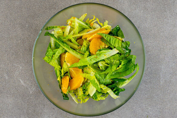 Den Salat in Streifen schneiden, dabei den Strunk entfernen. Aus 1EL Olivenöl, dem restlichen Zitronensaft, 2EL Wasser, der ½ der Orangenschale sowie je 1 Prise Salz und Pfeffer ein Dressing anrühren und mit den Orangenspalten unter den Salat mengen.