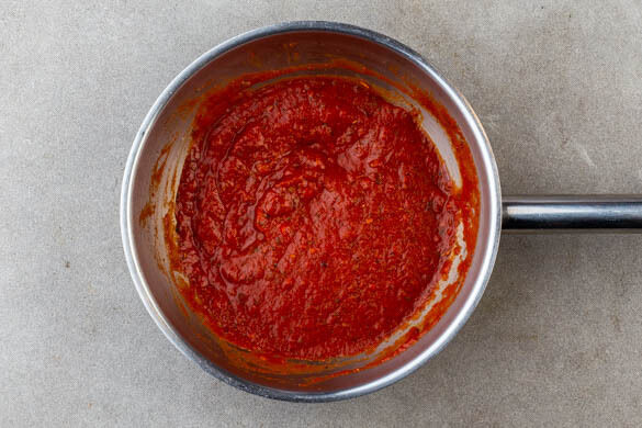 Die geschälte Zwiebelhälfte halbieren und eine Hälfte würfeln, die andere Hälfte in dünne Streifen schneiden. Die Peperoni und die Zwiebelwürfel in einem kleinen Topf mit 1EL Olivenöl bei mittlerer Hitze in ca. 3Min. weich braten. Die Gewürzmischung zugeben und ca. 30Sek. mitbraten. Mit 1TL Essig ablöschen, die passierten Tomaten einrühren und ca. 5Min. köcheln lassen.