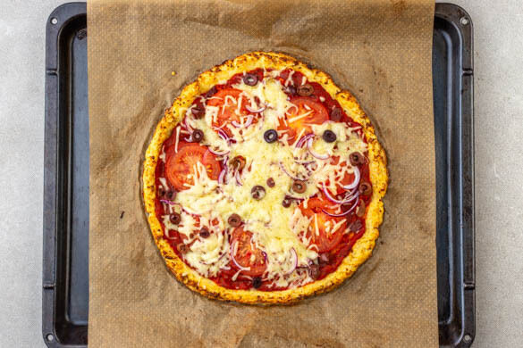Ein Pizzateig muss gar nicht immer mit Mehl und Hefe sein. Heute bereitest du ihn stattdessen mit Blumenkohlreis und geriebenem Käse zu. Vor dem Backen belegst du deinen Low-Carb-Teig mit einer würzigen Sauce aus passierten Tomaten und Peperoni, Zwiebeln und Oliven. Mit Basilikum garniert und einem feinen Spinatsalat als Beilage kannst du bei diesem italienischen Klassiker nichts falsch machen. Buon appetito!