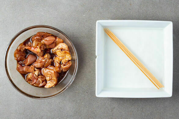 In einem mittelgroßen Topf ausreichend gesalzenes Wasser für die Nudeln zum Kochen bringen. Bei Verwendung von Schaschlikspießen aus Holz, diese in kaltem Wasser einweichen. Das Fleisch trocken tupfen und in 3–4cm große Würfel schneiden. 2EL hellen Essig mit der Teriyakisauce verrühren, das Fleisch untermengen und beiseitestellen.