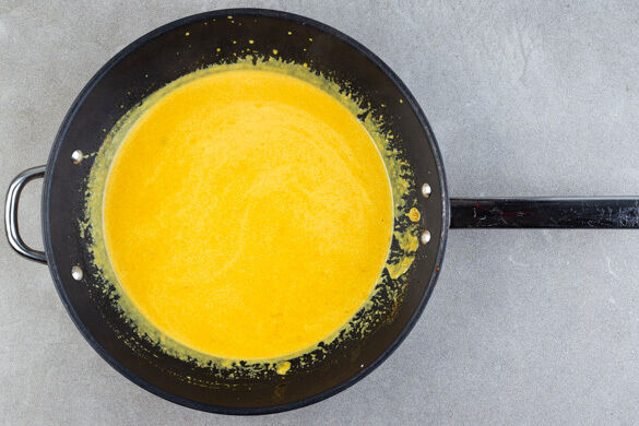 Die Currypaste in einer mittelgroßen Pfanne mit 80g veganer Margarine bei mittlerer Hitze 30Sek.–1Min. unter Rühren anbraten, dann mit der Kokosmilch und 100ml Wasser ablöschen und die Sauce bei mittlerer bis niedriger Hitze 4–6Min. sanft einköcheln lassen.