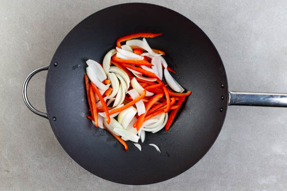 In einem mittelgroßen Topf ausreichend gesalzenes Wasser für die Nudeln zum Kochen bringen. Die Zwiebel schälen, halbieren und in ca. 1cm breite Spalten schneiden. Die Paprika vierteln, entkernen und in dünne Streifen schneiden. Die Zwiebeln und die Paprika in einer großen Pfanne oder einem Wok mit 1EL Pflanzenöl bei mittlerer Hitze in 5–7Min. weich braten.