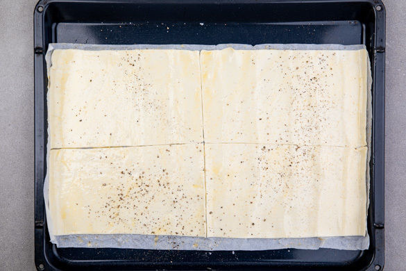 Die Teige mit dem Papier nach unten auf zwei Backblechen ausrollen, jeweils in 4 gleich große Stücke schneiden und nach Belieben mit etwas Pfeffer würzen. Tipp: Wer mag, kann den Teig mit verquirltem Eigelb bestreichen. Im Ofen 8–10Min. backen, bis der Teig schön aufgegangen und goldbraun ist. Je nach Ofen die Position der Bleche nach der Hälfte der Zeit tauschen.