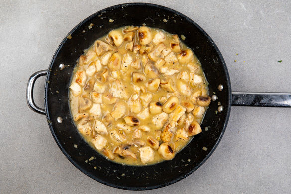 Das Fleisch in einer großen Pfanne mit 2EL Olivenöl bei mittlerer Hitze 2–3Min. goldgelb anbraten. Die Pilze und die Zwiebeln dazugeben und 2–3Min. mitbraten. 1EL Mehl unterrühren, dann mit 300ml Wasser ablöschen. Das Brühgewürz dazugeben und das Frikassee 5–10Min. sanft köcheln lassen. Bei Bedarf noch etwas Wasser hinzufügen.