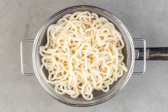 In einem Wasserkocher ausreichend Wasser für die Nudeln zum Kochen bringen. Die Nudeln mit heißem Wasser bedecken und 2–3Min. ziehen lassen, dabei gelegentlich umrühren. In ein Sieb abgießen, kalt abschrecken und abtropfen lassen.