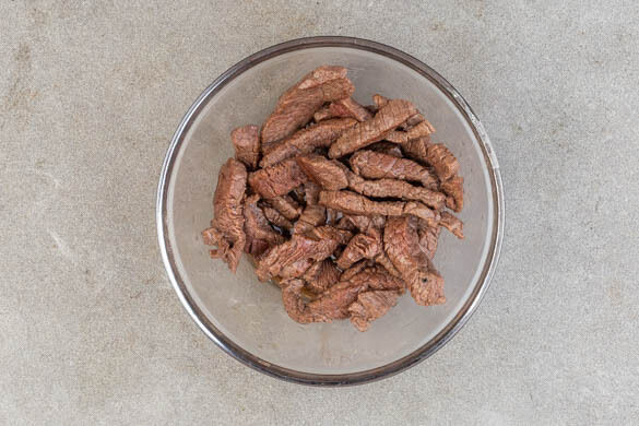 Das Fleisch trocken tupfen und in einer großen Pfanne oder einem Wok mit 1EL Pflanzenöl bei starker Hitze 1–2Min. braten. Mit je 1 Prise Salz und Pfeffer würzen, aus der Pfanne nehmen und abgedeckt beiseitestellen.