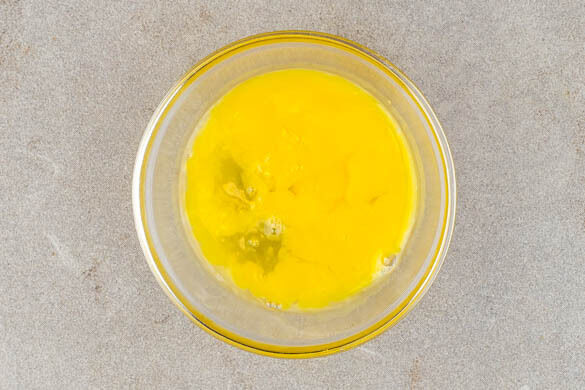 Die Eier aufschlagen und mit einer Gabel nur ganz leicht verquirlen, sodass Eiweiß und Eigelb nicht vollständig vermischt sind.