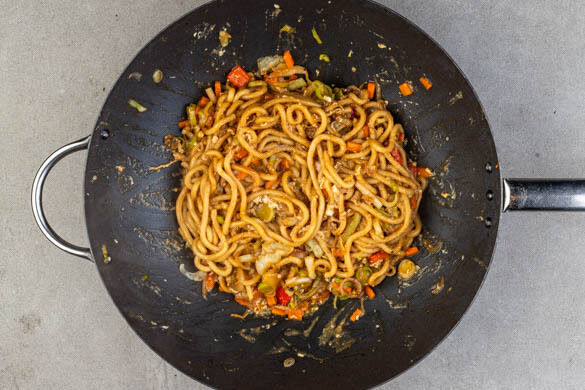 Den Gemüsemix in derselben Pfanne mit 1EL Pflanzenöl bei starker Hitze ca. 2Min. anbraten, bis das Gemüse anfängt weich zu werden. Die Nudeln zugeben und 3–4Min. mitbraten, dabei gelegentlich umrühren. Mit ½TL Salz und 1 kräftigen Prise Pfeffer würzen.