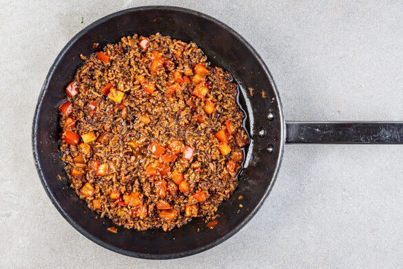 Das Hackfleisch in einer mittelgroßen Pfanne mit 1EL Pflanzenöl bei mittlerer Hitze in 4–6Min. goldbraun anbraten. Die Tomaten, die Hoisinsauce und 30ml Wasser hinzugeben und bei niedriger Hitze ca. 10Min. einköcheln lassen. Bei Bedarf etwas mehr Wasser hinzufügen.