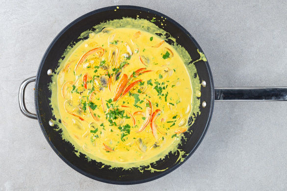 Die Paprika vierteln, entkernen und in dünne Streifen schneiden. Die Pilze ggf. säubern und in dünne Scheiben schneiden. Den Knoblauch in einer großen Pfanne mit 1EL Pflanzenöl bei mittlerer Hitze ca. 30Sek. anbraten. Die Paprika, die Pilze und das Currypulver dazugeben und 2–3Min. braten. Mit Salz und Pfeffer abschmecken.