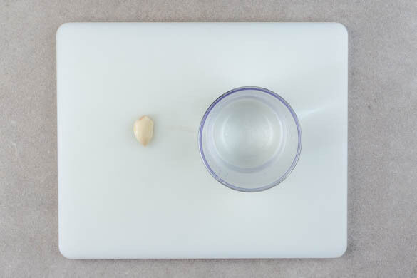 Den Reis in einem Sieb kalt abspülen, bis das Wasser klar bleibt, und abtropfen lassen. Den Knoblauch schälen. 125ml heißes Wasser bereitstellen.