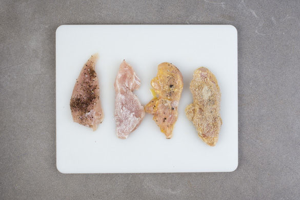 Das Fleisch trocken tupfen, schräg in ca. 4 dünne Schnitzel schneiden und mit Salz und Pfeffer würzen. Das restliche Ei mit einer Gabel verquirlen. Die Schnitzel nacheinander in etwas Mehl wenden, durch das verquirlte Ei ziehen und in den Semmelbröseln wenden, bis sie gut bedeckt sind. Die Panade leicht andrücken.