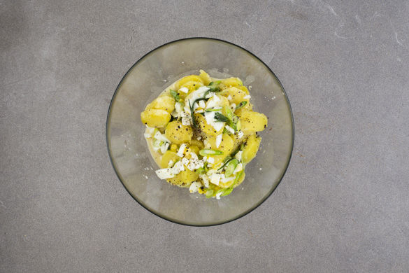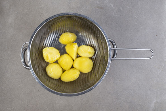 In einem großen Topf ausreichend gesalzenes Wasser für die Kartoffeln zum Kochen bringen. Die Kartoffeln schälen, größere Kartoffeln halbieren. Im kochenden Wasser 15–20Min. kochen, bis die Kartoffeln gar sind. Tipp: Die Kartoffeln sind durch, wenn sie sich bei der Messerprobe leicht vom Messer lösen. In ein Sieb abgießen und kurz abkühlen lassen.