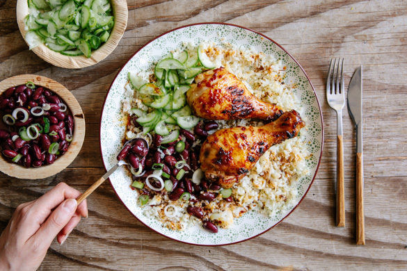 Leckere Hähnchenkeulen sind doch immer wieder eine Freude, die man am besten genießt, indem man das zarte Fleisch mit den Zähnen vom Knochen löst. Fingerabschlecken ist heute ausdrücklich erlaubt, denn von der köstlich-würzigen Sauce mit Sambal Oelek und Ingwer wollen wir nichts, aber auch gar nichts übrig lassen. Sie verfeinert auch die Kidneybohnen. Serviert wird alles mit Blumenkohlreis und Gurkensalat.