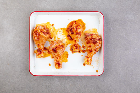 Das Fleisch mit etwas Küchenkrepp trocken tupfen und mit der Würzsauce einreiben. Die Würzsauce am besten mit den Händen in das Fleisch einmassieren. Die Hähnchendrumsticks in eine Auflaufform geben, abtropfende Würzsauce aufbewahren. Die Drumsticks im Ofen 20–25Min. backen, sie knusprig und in der Mitte gar sind. Nach der Hälfte der Zeit einmal wenden.