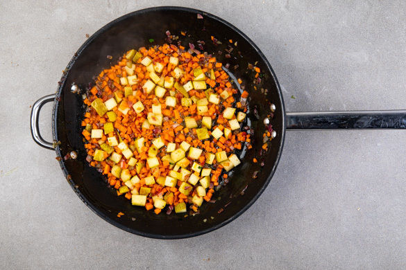 Die Zwiebeln und die Karotten in einer mittelgroßen Pfanne mit 1EL Olivenöl bei mittlerer Hitze 2–3Min. anschwitzen. Die Birnenwürfel, 4EL Wasser und 2EL Essig zugeben, alles mit etwas Zucker, Salz und Pfeffer würzen und weitere 1–2Min. dünsten.