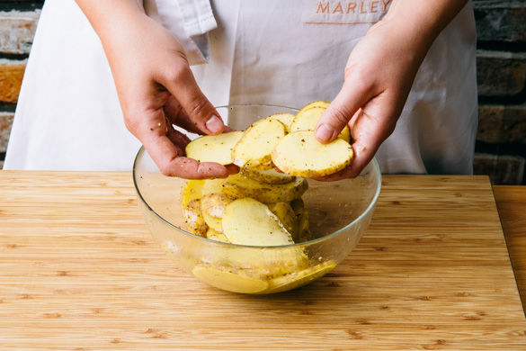 Den Backofen auf 220°C Umluft (240°C Ober-/Unterhitze) vorheizen. Die Kartoffeln samt Schale in ca. 0,5cm dünne Scheiben schneiden. Mit 1EL Olivenöl, ca. 1EL Gewürzmischung und etwas Salz vermengen.