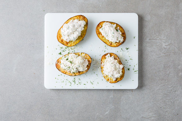 Die Backkartoffeln mit einer Gabel etwas aushöhlen, das Innere auflockern und wieder zurück in die Mulde drücken. Die Forellencreme gleichmäßig auf den Kartoffeln verteilen und mit dem Käse und dem Dill garnieren. Die Kumpir mit den Spiegeleiern servieren.