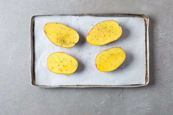 Den Backofen auf 230°C Umluft (250°C Ober-/Unterhitze) vorheizen. Die Kartoffeln halbieren, mit einer Gabel mehrmals einstechen, mit etwas Olivenöl einreiben und auf einem mit Backpapier ausgelegten Backblech 30–45Min. backen, bis die Gabel ohne Widerstand in die Kartoffeln einzustechen geht.