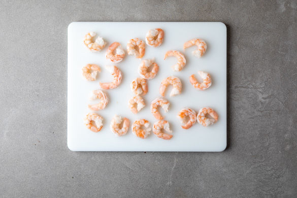 In einem großen Kochtopf ausreichend gesalzenes Wasser für die Nudeln zum Kochen bringen. Die Garnelen in einem Sieb mit kaltem Wasser abspülen, gut abtropfen lassen und mit einem Küchentuch gut trocken tupfen.
