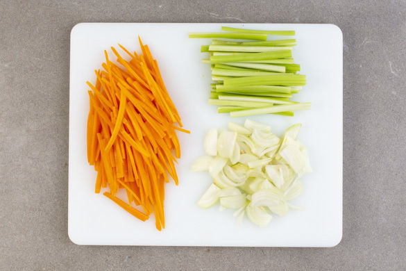 Die Karotte schälen, längs halbieren und in lange, dünne Streifen schneiden. Den Stangensellerie quer halbieren und in dünne Streifen schneiden. Die Zwiebel schälen, halbieren und ebenfalls in feine Streifen schneiden.