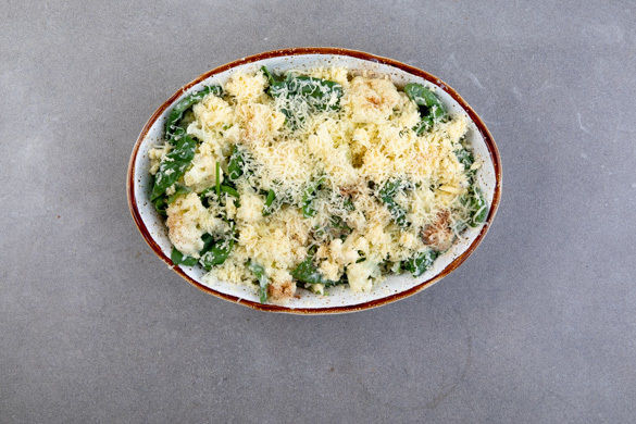 Die Blumenkohl-Spinat-Käse-Masse in eine Auflaufform geben und sicherstellen, dass alles mit der Sauce bedeckt ist. Mit dem restlichen Käse und der restlichen Muskatnuss nach Geschmack bestreuen und den Auflauf 8–10Min. im Ofen überbacken, bis der Käse schön gebräunt ist.