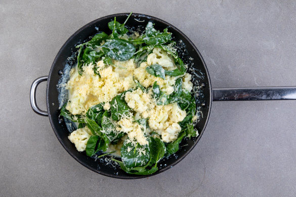 Die Pfanne erneut stark erhitzen, die restliche Milch und die Creme hineingeben und unter Rühren aufkochen lassen. Ca. 2Min. köcheln lassen, dann mit ca. 100ml Kochwasser ablöschen und ca. 2/3 des Käses sowie den Spinat und den Blumenkohl untermengen.